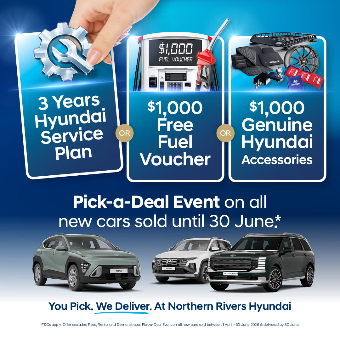 *Terms and conditions apply. All customers who purchase a new Hyundai vehicle between 1 April 2026 and 30 June 2026 and with a vehicle delivery on or prior to 30 June 2026 will be eligible one (1) opportunity per purchased vehicle to select one of the three offered deals. The deal will be issued to the customer on delivery of their vehicle on or prior to 30 June 2026, or if the customer chooses a Voucher, the Voucher will be delivered within one (1) week of vehicle delivery. Excludes government, fleet, demonstrator vehicles, and rental buyers. Deals offered include: 3 years Hyundai Service Plan, $1,000 Fuel Voucher, and $1,000 Voucher for Genuine Hyundai Accessories. Offer is subject to change, cancellation, and not available in conjunction with any other offer or discount.